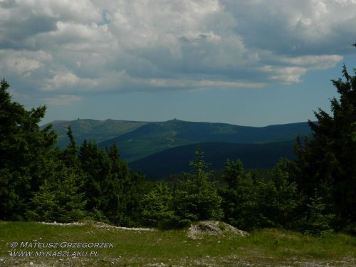 Trzecim szczytem, który tego dnia zdobyliśmy było najwyższe wzniesienie Gór Izerskich Wysoka Kopa (1126 m). Na niego również nie prowadzi oznaczona ścieżka, dlatego tak jak poprzednio wszystko dokładnie opiszę. Podróż rozpoczęliśmy z Rozdroża Izerskiego. Są tam dwa duże parkingi i miejsca na pewno nigdy nie zabraknie. Na wyjście na szczyt wybraliśmy szlak zielony, chociaż dociera on niewiele po za nieczynną kopalnię kwarcu Stanisław. Początkowa faza marszu jest łagodna, chociaż to dopiero cisza przed burzą. Potem po odbiciu w prawo przez około 30 minut, wędruje się cały czas stromo pod górę. Nie jest to strasznie strome podejście ale człowiek się może nieźle spocić. Gdy już się namęczymy to wyjdziemy na wspomniane rozdroże.Odbiliśmy w prawo i ruszyliśmy w stronę Wysokiej Kopy (1126 m). Po drodze mijaliśmy wiele różnych rodzajów skał. Używając wyobraźni można zobaczyć na nich co się chce. Dopiero tutaj spotkaliśmy pierwsze osoby na szlaku. Tak się złożyło, że dzień później również spotkaliśmy tych samych ludzi. Na tym odcinku szlaku można już dostrzec pasmo Karkonoszy z wyróżniającymi się Śnieżnymi Kotłami i Szrenicą.