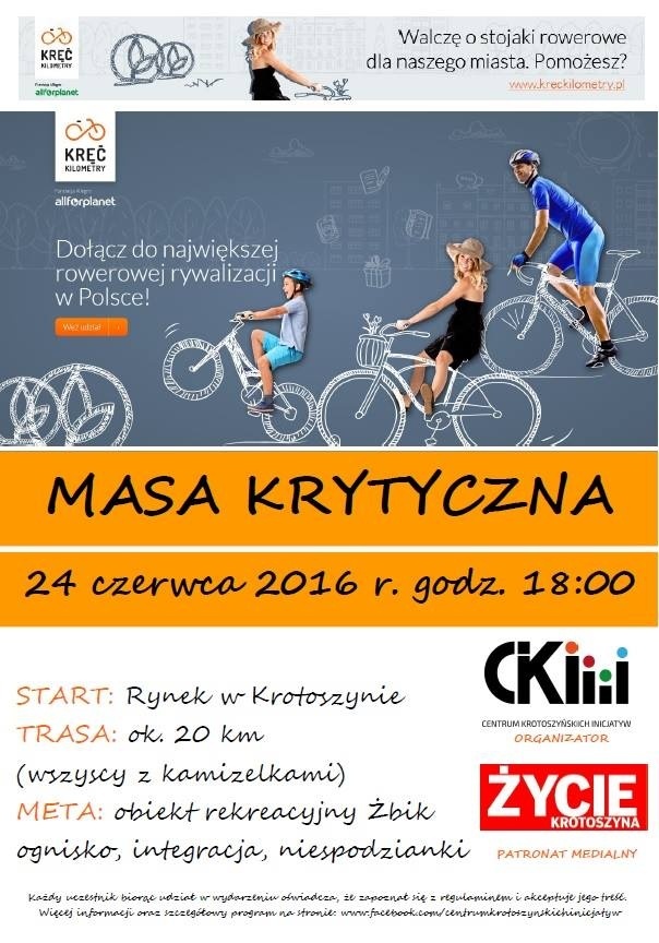 Już w piątek 24 czerwca o godz. 18.00 ruszy kolejna Krotoszyńska Masa Krytyczna. Startując z krotoszyńskiego Rynku mamy szansę na powiększenie naszego dorobku przebytych kilometrów w ramach akcji Kręć Kilometry organizowanej przez Fundację All For Planet. W tej chwili jesteśmy na 21. miejscu w rankingu, a na stojaki ma szansę tylko 20 pierwszych miast - informuje portal krotoszyńskiego ratusza.