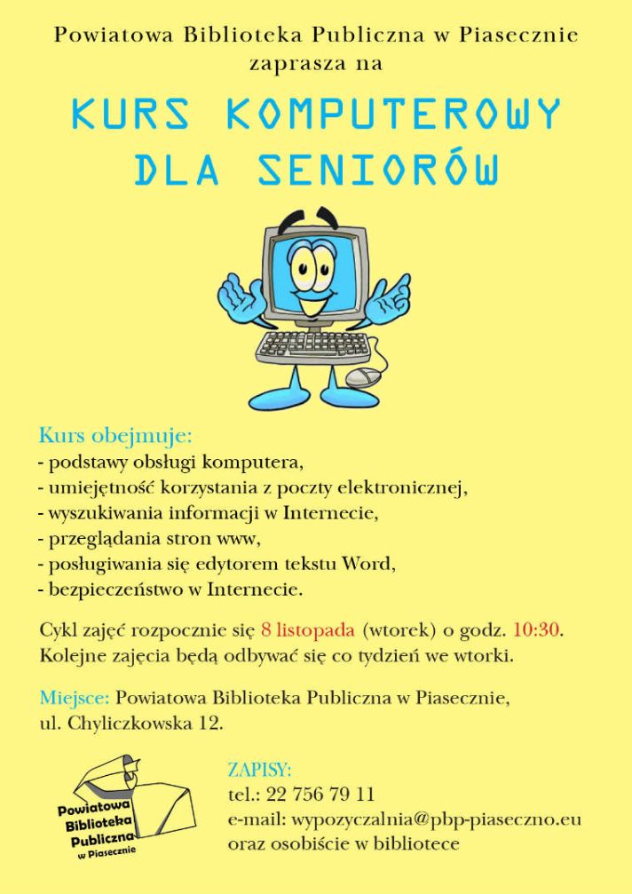 8 listopada, o godz. 10:30 Powiatowa Biblioteka Publiczna w Piasecznie zaprasza seniorów na kurs komputerowy.