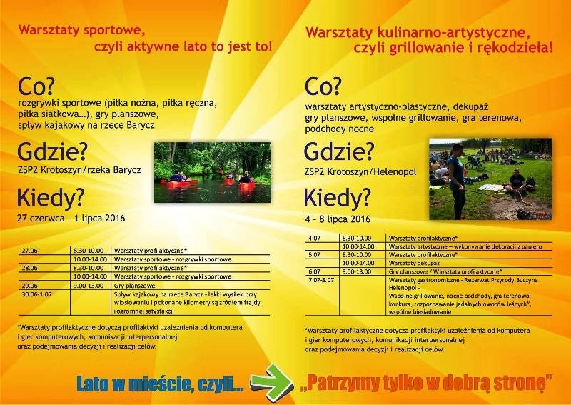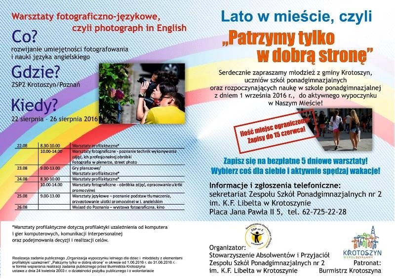 Stowarzyszenie Absolwentów i Przyjaciół Zespołu Szkół Ponadgimnazjalnych nr 2 w Krotoszynie zaprasza młodzież ze wszystkich szkół ponadgimnazjalnych na aktywny, letni wypoczynek w naszym mieście - poinformował portal krotoszyńskiego magistratu.