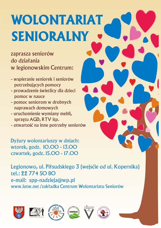 Z inicjatywy zarządu Stowarzyszenia Pomocy Potrzebującym NADZIEJA w Legionowie z dniem 1 lipca 2016 roku rozpoczęło oficjalną działalność Legionowskie Centrum Wolontariatu Seniorów. Centrum funkcjonuje jako niesamodzielna jednostka Stowarzyszenia mająca swój regulamin. Na pierwszym zebraniu organizacyjnym do Centrum przystąpiło 25 legionowskich seniorów, którzy chcą poświęcić swój wolny czas, umiejętności i entuzjazm innym ludziom.