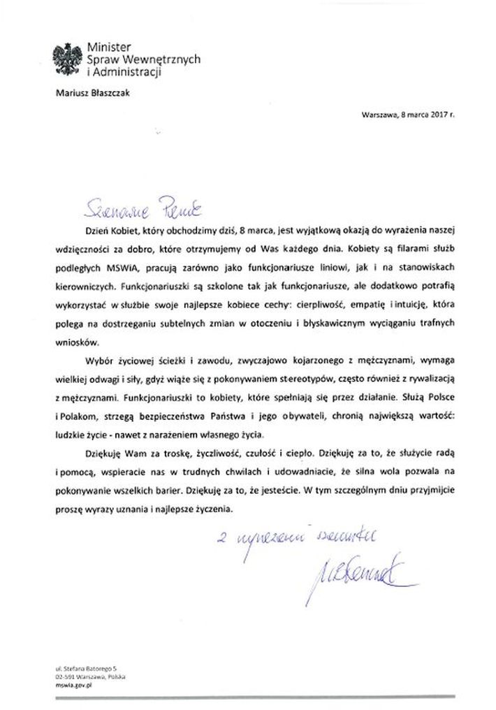 Z okazji przypadającego Dnia Kobiet minister spraw wewnętrznych i administracji Mariusz Błaszczak skierował list do wszystkich Pań pracujących w naszej formacji. Podkreślił w nim rolę, jaką kobiety spełniają w systemie ochrony prawa i porządku w naszym kraju. Podziękował też za wprowadzenie do codziennej służby życzliwości, czułości i ciepła.