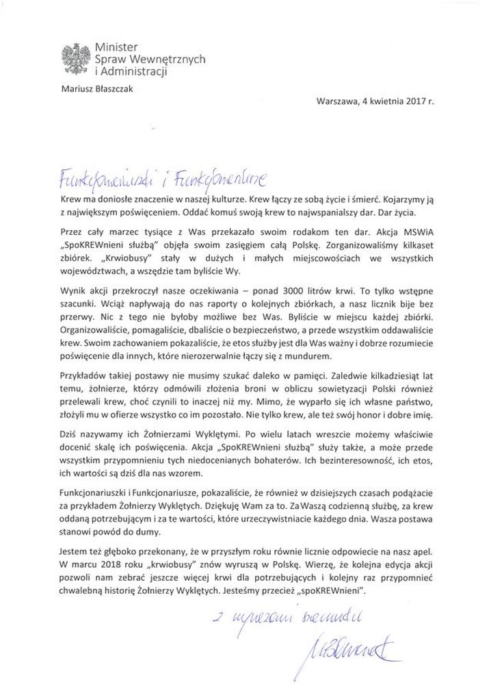 List ministra MSWiA z podziękowaniem za udział w akcji „SpoKREWnieni służbą”