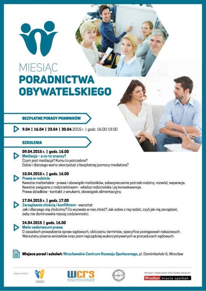 Jak co roku na wiosnę Wrocławskie Centrum Rozwoju Społecznego oraz Stowarzyszenie Karta 99, organizuje bezpłatne porady prawników oraz szkolenia dla osób, które chcą zwiększyć swoją wiedzę i umiejętności radzenia sobie w świecie przepisów prawnych.