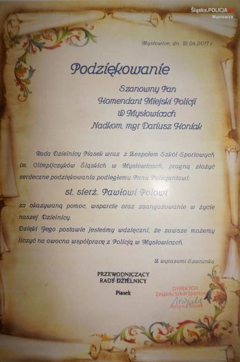 Rada Dzielnicy Piasek oraz Zespół Szkół Sportowych im. Olimpijczyków Śląskich w Mysłowicach podziękowali dzielnicowemu za okazaną pomoc, wsparcie oraz zaangażowanie w życie mieszkańców.