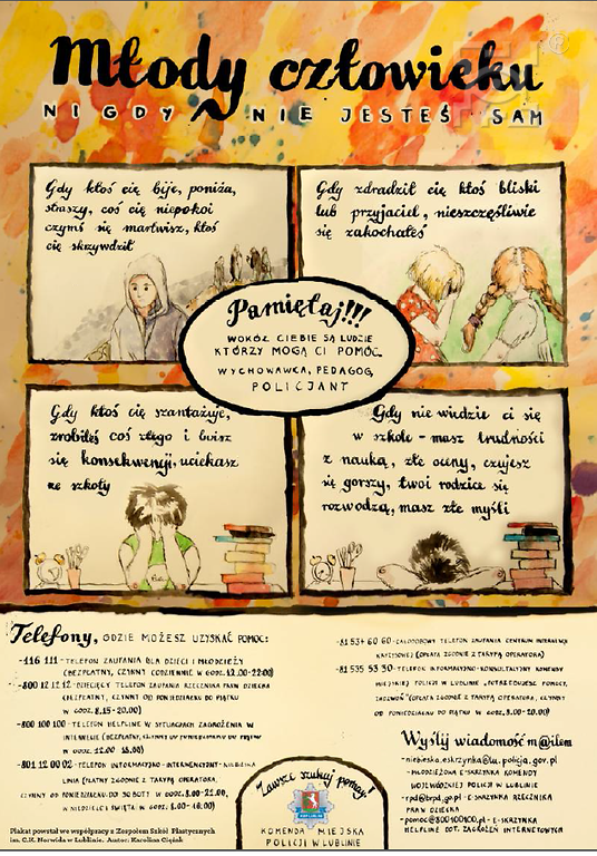 Komenda Miejska Policji w Lublinie przy współpracy z Zespołem Szkół Plastycznych im. Cypriana Kamila Norwida przygotowała plakat pt. MŁODY CZŁOWIEKU, NIGDY NIE JESTEŚ SAM. Plakat zawiera listę instytucji, w których można uzyskać pomoc w sytuacjach problemowych. Są wśród nich: