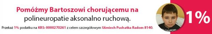 tej wspaniałej młodzieży: Izabeli Lackowskiej, Danucie Wasilewskiej i Marzenie Bonieckiej. Fundacja opiekuje się także dziećmi wymagającymi długotrwałej opieki medycznej. Obecnie Fundacja Uśmiech Puchatka prosi darczyńców o zadysponowanie obowiązkowego 1 proc. rozliczenia podatkowego PIT na rzecz Bartosza chorującego przewlekle na polineuropatię aksonalno ruchową. Cel: Fundacja Uśmiech Puchatka Radom 8140 KRS Fundacji Młodzi Młodym 0000270261 |