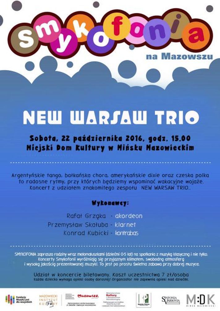 Zapraszamy dzieci i rodziców na spotkanie z muzyką klasyczną - Smykofonia na Mazowszu, New Warsaw Trio, 22 października o godz. 15:00 do Miejskiego Domu Kultury.