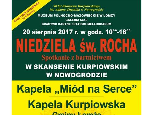 Muzeum Północno-Mazowieckie oraz Galeria 6na9 Agnieszki Zielewicz i Bractwo Bartne Fratrum Mellicidarum serdecznie zapraszają 20 sierpnia 2017 roku, w godz. 10:00-18:00, do Skansenu Kurpiowskiego im. Adama Chętnika w Nowogrodzie na XXI „Niedzielę św. Rocha”. Głównym tematem tegorocznej imprezy będzie bartnictwo. Miejskie Przedsiębiorstwo Komunikacji oferuje dowóz autobusem z Łomży do Nowogrodu za opłatą w wysokości 5 zł w obie strony.