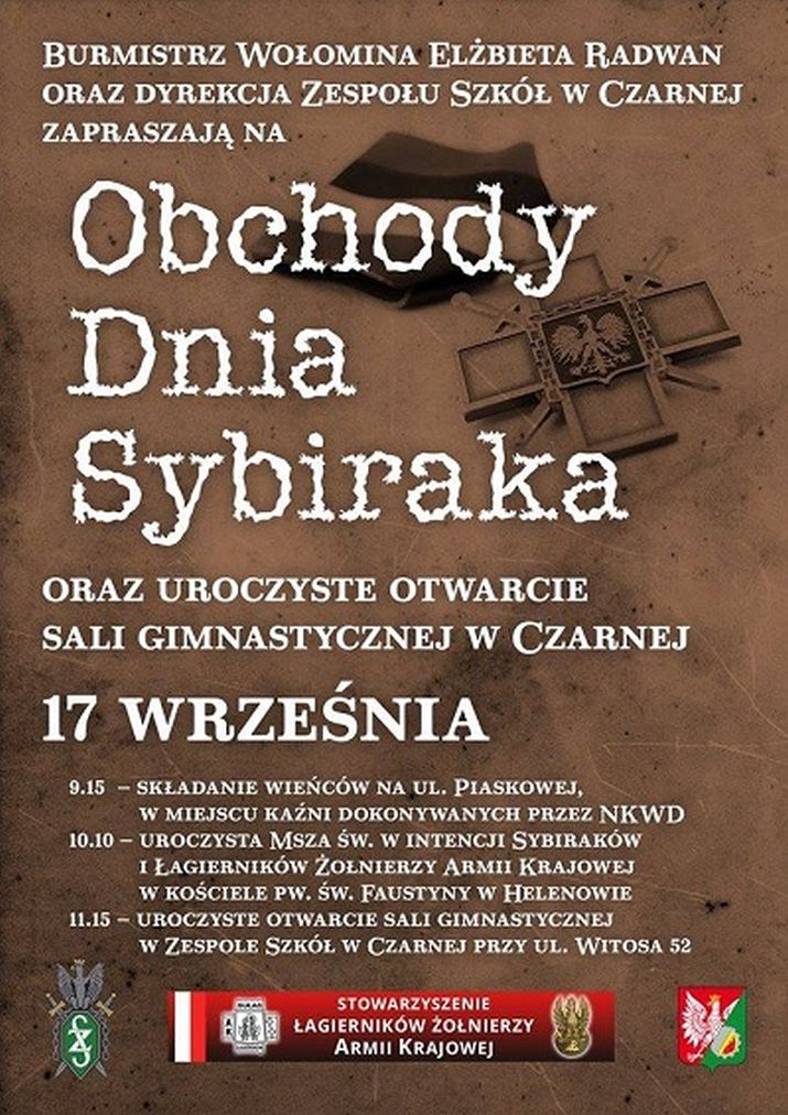 17 września, w rocznicę napaści Sowieckiej na Polskę, obchodzimy Światowy Dzień Sybiraka. W Wołominie uroczystości rozpoczną się na ul. Piaskowej, w miejscu kaźni dokonywanych przez NKWD. O godz. 10:10 w kościele pw. Św. Faustyny w Helenowie zostanie odprawiona msza św. w intencji Sybiraków i Łagierników Żołnierzy Armii Krajowej. Następnie w Zespole Szkół w Czarnej, przy ul. Witosa 52 odbędzie się otwarcie nowej sali gimnastycznej. (jkd)