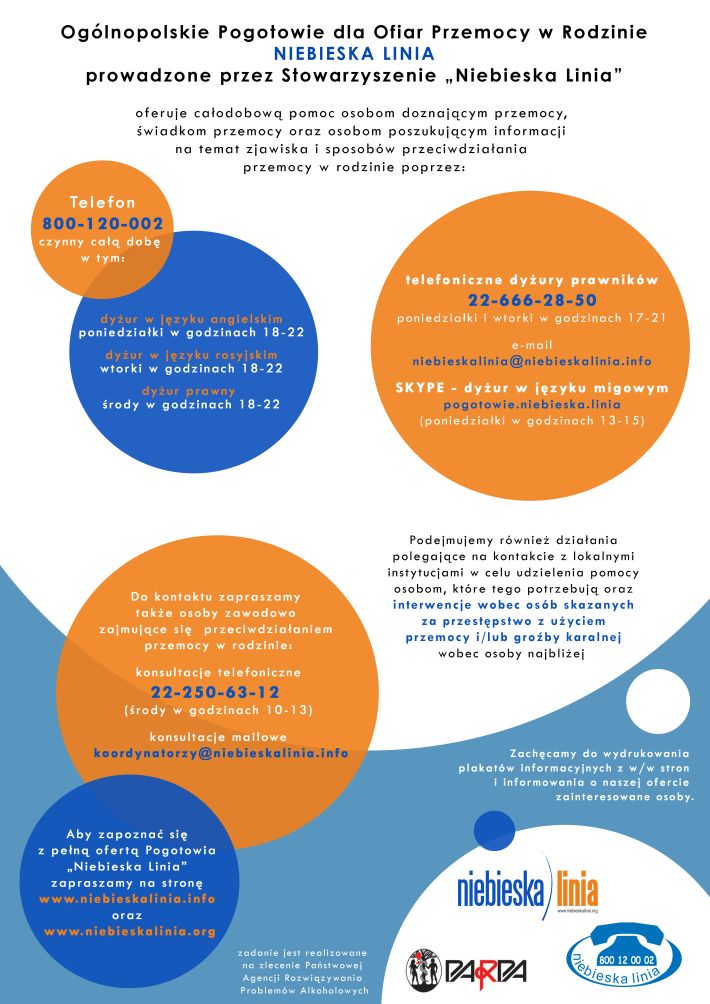 Ogólnopolskie Pogotowie dla Ofiar Przemocy w Rodzinie "Niebieska Linia" oferuje całodobową pomoc osobom doznającym przemocy, świadkom przemocy oraz osobom poszukującym informacji na temat zjawiska i sposobów przeciwdziałania przemocy w rodzinie.