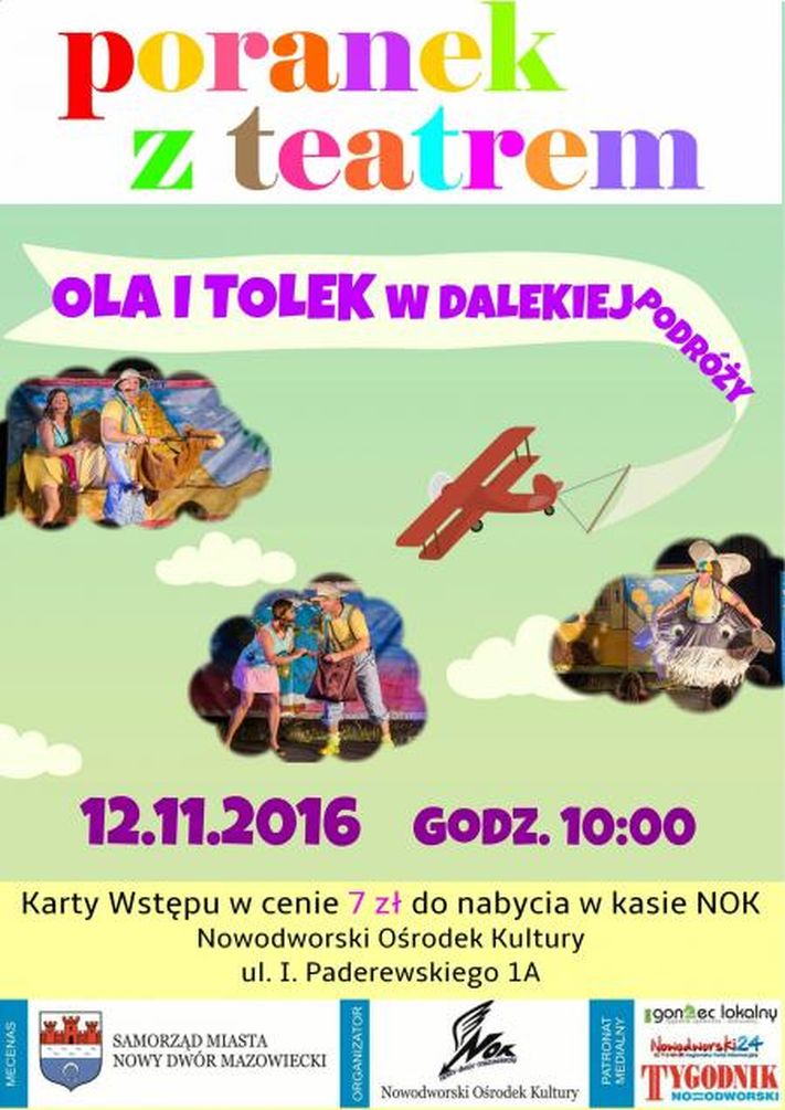 12 listopada, o godz. 10:00 zapraszamy do Nowodworskiego Ośrodka Kultury na "Poranek z teatrem", podczas którego obejrzymy spektakl "Ola i Tolek w dalekiej podróży".