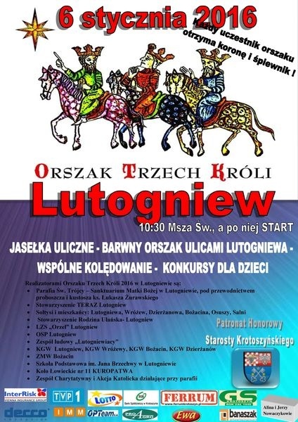 6 stycznia 2016 roku ulicami Lutogniewa (powiat Krotoszyn) przejdzie Orszak Trzech Króli. Start poprzedzi msza święta, która rozpocznie się o godzinie 10.30.