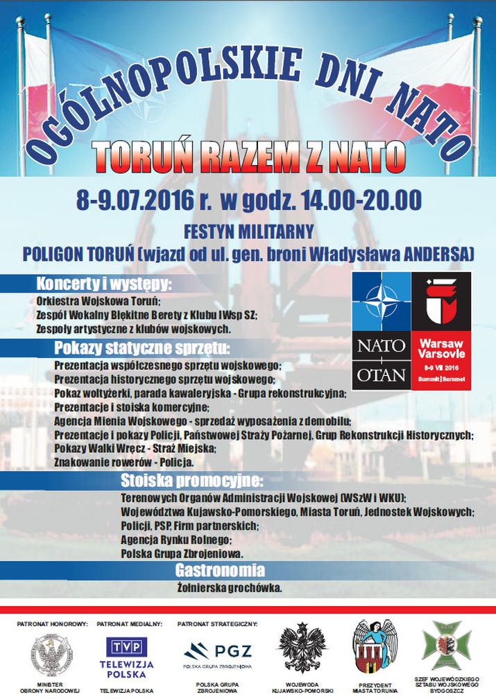 Wojewoda Mikołaj Bogdanowicz zaprasza mieszkańców regionu na festyn rodzinny "Toruń razem z NATO", który odbędzie się 8 i 9 lipca, na terenie Ośrodka Szkolenia Poligonowego w Toruniu.
