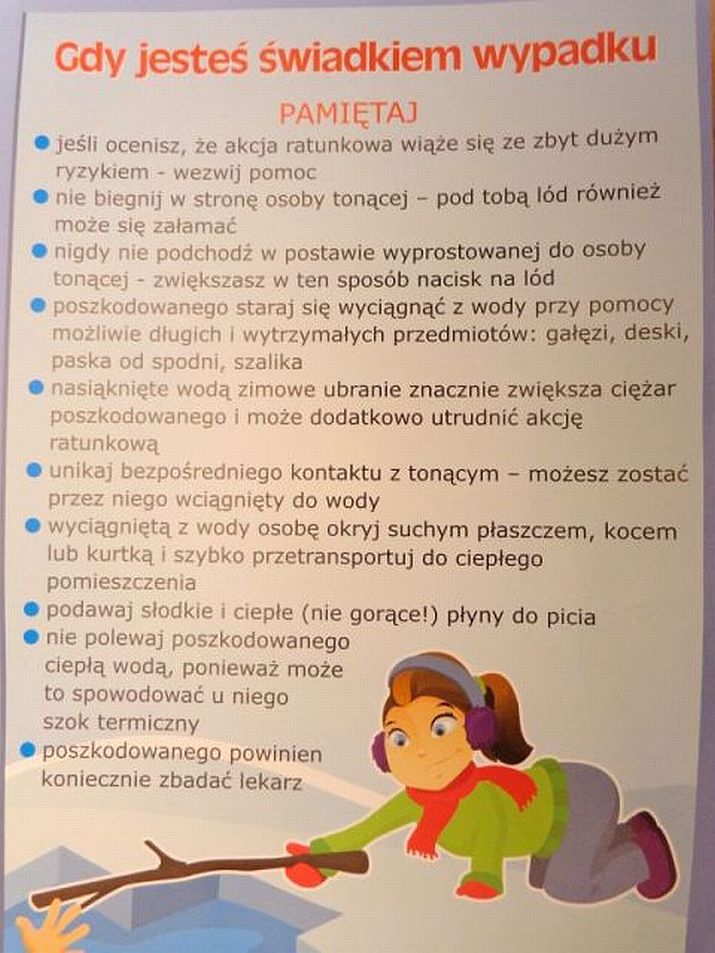 - nie podchodź do miejsca, gdzie załamał się lód. Jeśli się na nim znajdujesz połóż się płasko na tafli. Unikniesz w ten sposób miejscowego przeciążenia pokrywy lodowej;