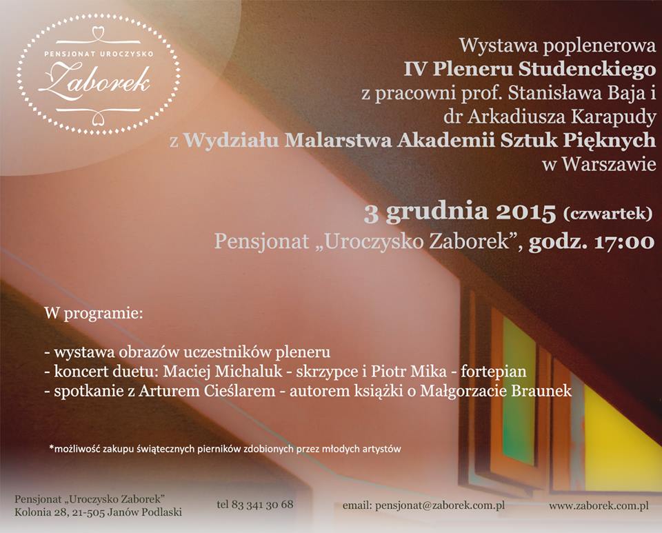W czwartek 3 grudnia o godzinie 17 w pensjonacie "Uroczysko Zaborek" w Janowie Podlaskim rozpocznie się wystawa poplenerowa IV Studenckiego Pleneru Malarskiego z pracowni prof. Stanisława Baja i dr. Arkadiusza Karapudy z Wydziału Malarstwa Akademii Sztuk Pięknych w Warszawie.