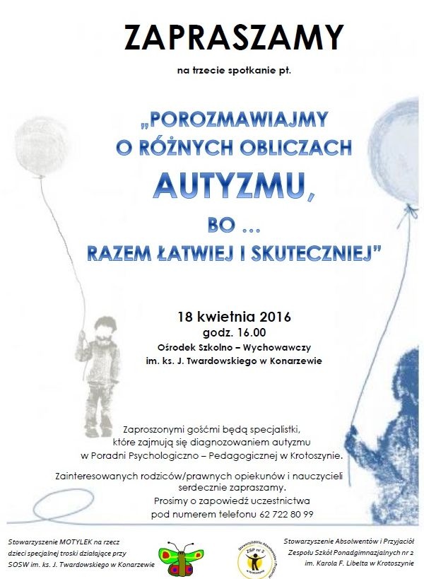 Porozmawiajmy o różnych obliczach autyzmu, bo... razem łatwiej i skuteczniej. 18 kwietnia 2016 r. o godz. 16.00 w Ośrodku Szkolno-Wychowawczym im. ks. Twardowskiego w Konarzewie odbędzie się 3. spotkanie rodziców dzieci z autyzmem - poinformował portal krotoszyńskiego ratusza.