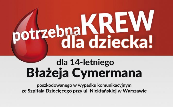 Krew jest niezbędna dla 14-letniego Błażeja Cymermana poszkodowanego w wypadku komunikacyjnym.