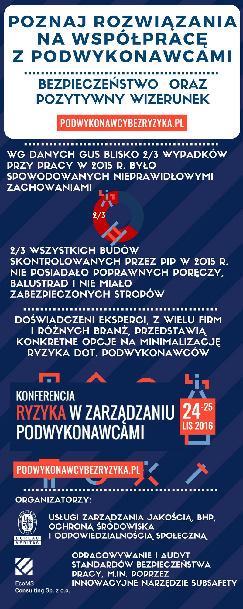 Konferencja organizowana przez EcoMS Consulting Sp. z o.o. i Bureau Veritas Polska Sp. z o.o.pomoże rozwiązać problem z małym wpływem na sposób pracy podwykonawców. Doświadczeni eksperci, z wielu firm i różnych branż, przedstawią konkretne opcje na minimalizację ryzyka związanego z podwykonawcami. Będą to narzędzia, metodologie, nowe kierunki w podejściu do bezpieczeństwa oraz już stosowane rozwiązania i normy. Poznaj je !www.podwykonawcybezryzyka.pl