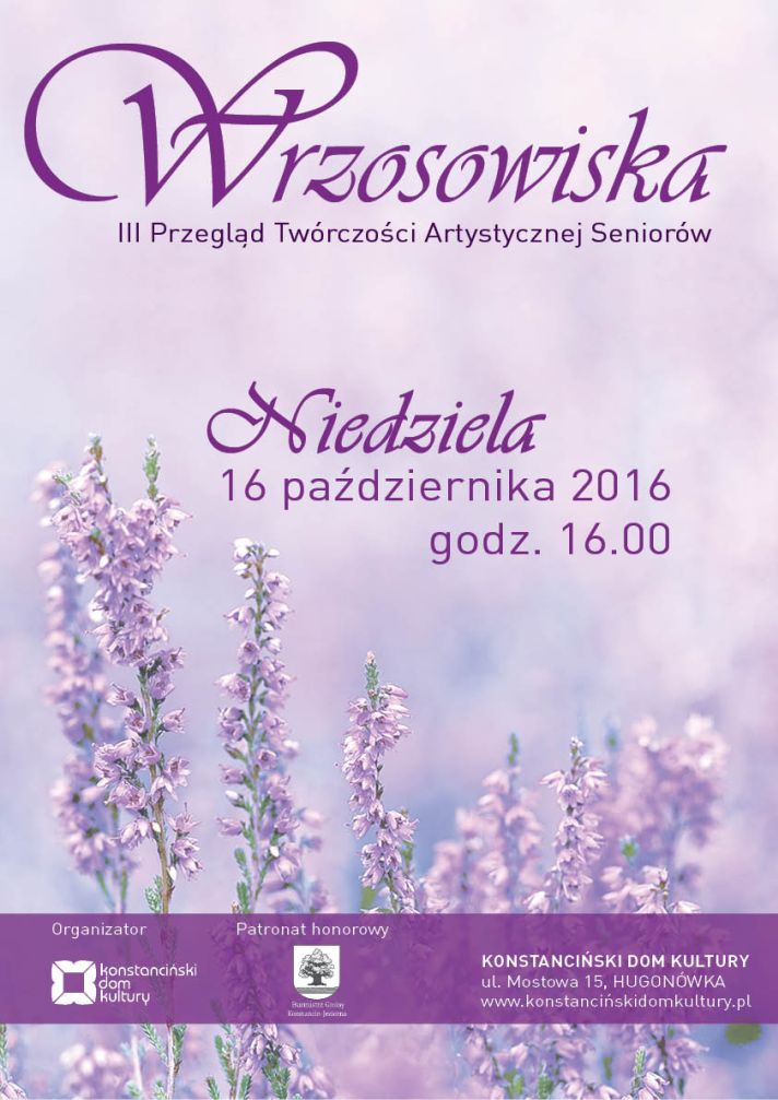 16 października na scenie Hugonówki odbędzie się doroczny przegląd twórczości seniorów - Wrzosowiska. Impreza organizowana przez Konstanciński Dom Kultury zacznie się o godz. 16:00.