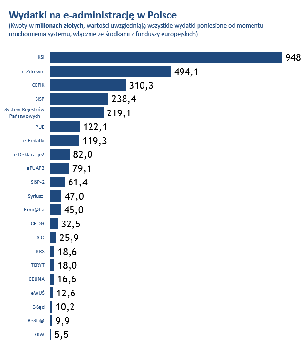 Na drugim biegunie zestawienia są projekty Ministerstwa Zdrowia - eZdrowie (system jeszcze nie wystartował) oraz Kompleksowy System Informatyczny Zakładu Ubezpieczeń Społecznych.