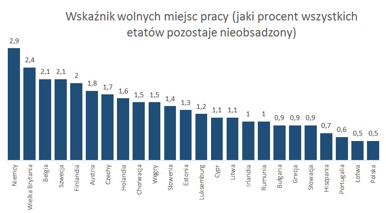Najwięcej wolnych miejsc pracy jest w gospodarkach tradycyjnie uznawanych za najlepiej poukładane - w Niemczech i Wielkiej Brytanii. Tylko nieco gorzej wygląda sytuacja w Belgii, Szwecji i Finlandii - we wszystkich tych krajach wolnych jest co najmniej 2 proc. ogółu miejsc pracy.