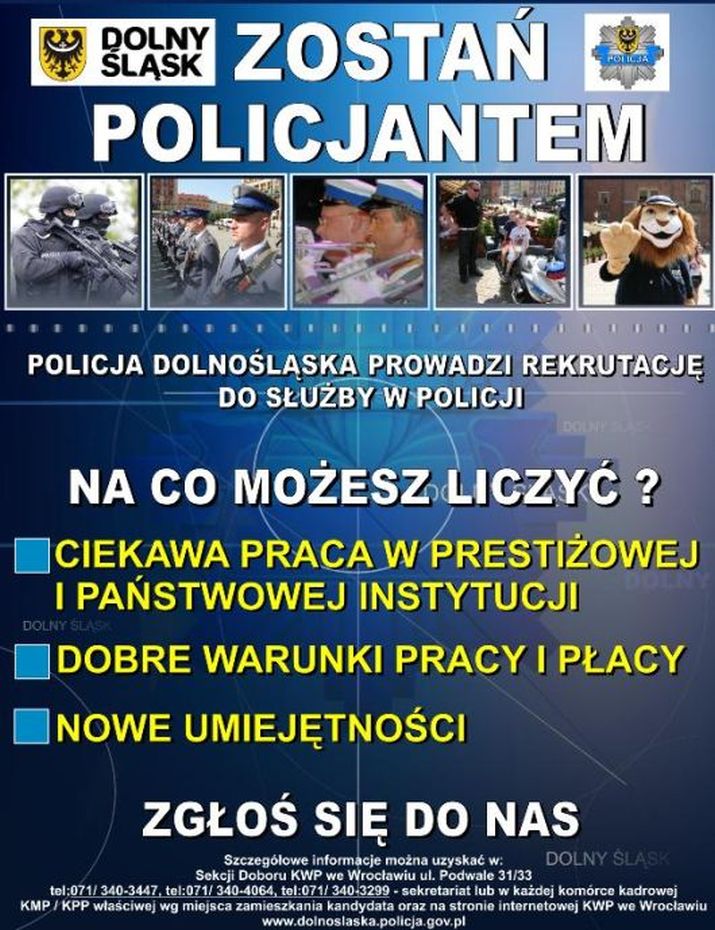 Dla tych, którzy chcą robić w życiu coś pożytecznego, czuć wyjątkowość swojej profesji i mieć stałość zatrudnienia, KWP we Wrocławiu prowadzi rekrutację do służby w policji. Policjant to zawód dla ludzi z pasją, wymagający i dający dużo w zamian. Spróbuj, bo naprawdę warto. Możesz zostać jednym z nas. Więcej informacji tutaj: http://www.dolnoslaska.policja.gov.pl/wr/praca-w-policji/sluzba-w-policji/104,Sluzba-w-policji.html (jkd)