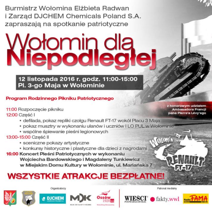 Serdecznie zapraszamy na Rodzinny Piknik Patriotyczny - Wołomin dla Niepodległej, który odbędzie się 12 listopada, na pl. 3 Maja oraz na koncert w MDK.