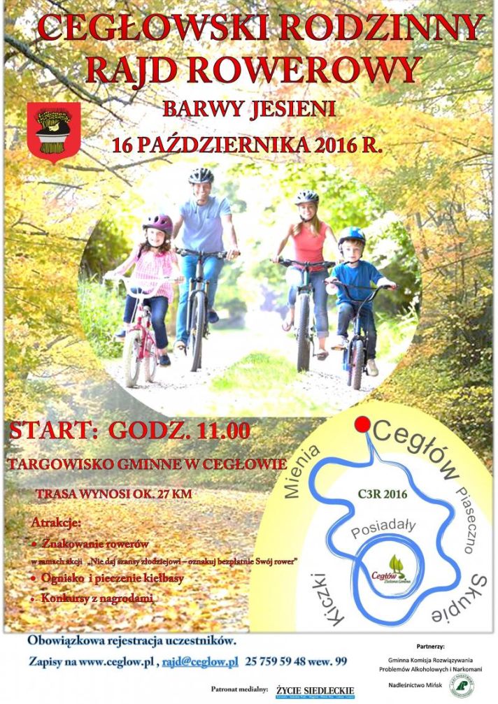 Urząd Gminy w Cegłowie zaprasza na Rodzinny Rajd Rowerowy, który odbędzie się 16 października, o godz. 11:00.