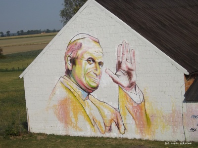 Autorem pracy jest młody krotoszyński artysta, student architektury na Politechnice Poznańskiej Łukasz Grobelny. Malowidło w całości przedstawia najważniejsze etapy życia i pontyfikatu Papieża Polaka. Reklama_________________________________________________________________________________________