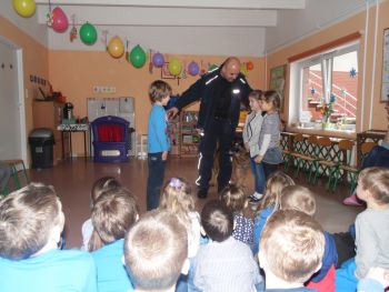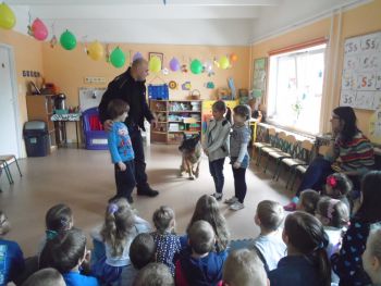 Dużą radość sprawił dzieciakom przewodnik psa służbowego asp. Radosław Kwiatkowski wraz z swoim czworonogim partnerem. Uczniowie dostrzegli jak należy opiekować się, a przede wszystkim zachowywać wobec nieznajomego psa. Oczywiście nie zabrakło pytań dotyczących pracy i wyszkolenia psiego policjanta. Takie lekcje bezpieczeństwa połączone z zabawą zawsze bardziej zapadają w pamięć. (jkd)