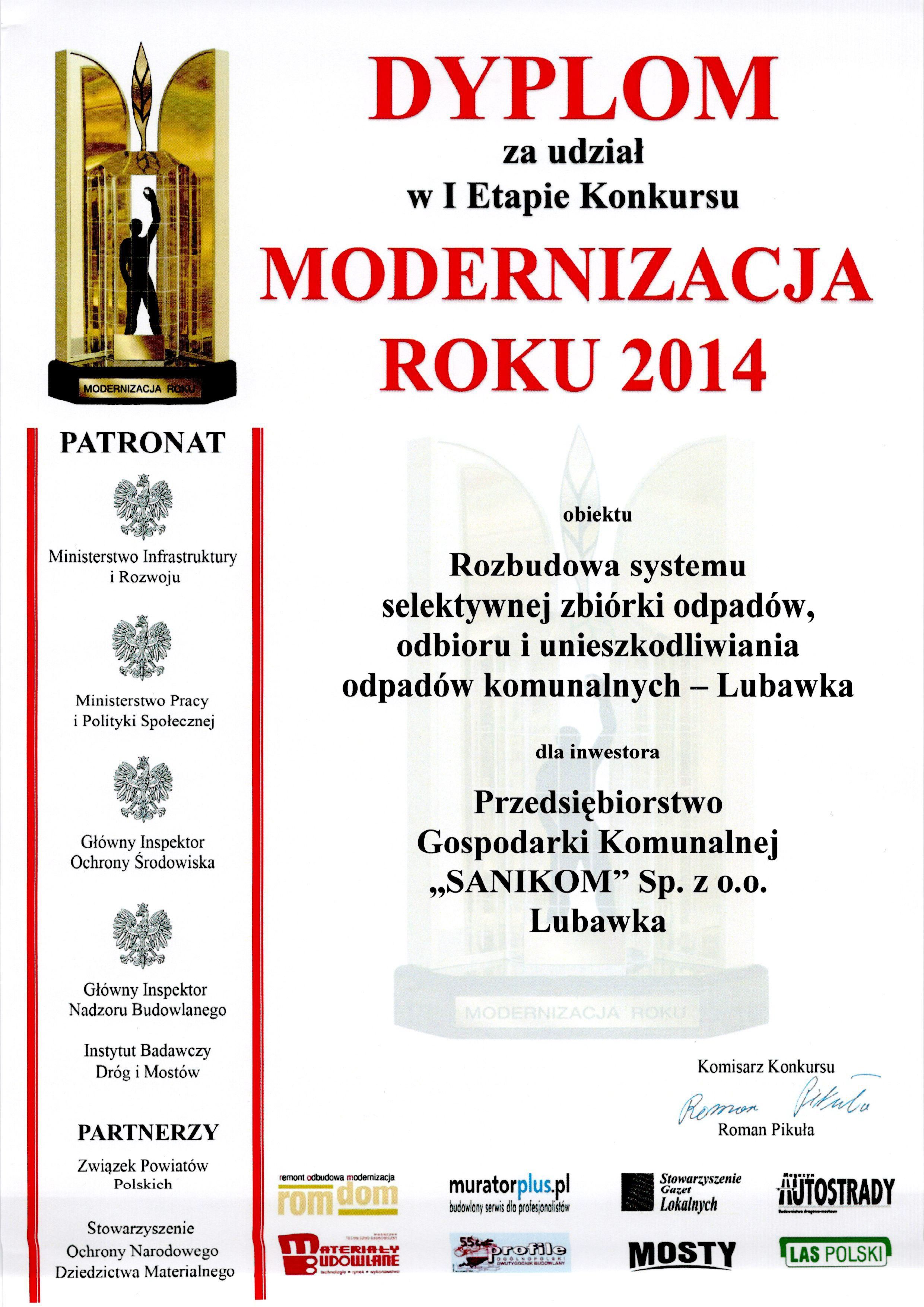 W ogólnopolskim konkursie „Modernizacja roku 2014” wyróżniono ostatnią inwestycję lubawskiej spółki Sanikom. Rozbudowę systemu selektywnej zbiórki odpadów, odbioru i unieszkodliwiania odpadów komunalnych doceniono m.in. :za nowoczesność technologii i rozwiązań projektowych, wysoką jakość wykonawstwa oraz wysokie efekty ekologiczne.