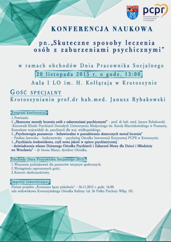 20 listopada br. w auli Liceum Ogólnokształcącego im. H. Kołłątaja w Krotoszynie odbędzie się konferencja naukowa pt. Skuteczne sposoby leczenia osób z zaburzeniami psychicznymi. Gościem specjalnym konferencji będzie prof. dr hab. med. Janusz Rybakowski.