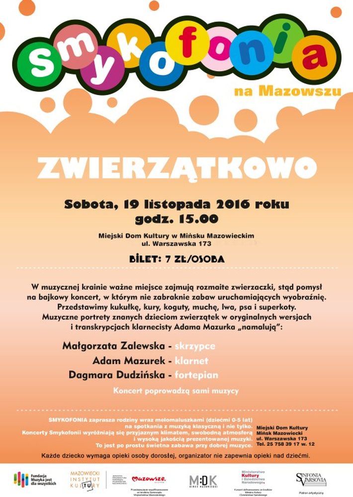 Miejski Dom Kultury w Mińsku Mazowieckim zaprasza 19 listopada, o godz. 15:00 na koncert "Zwierzątkowo".