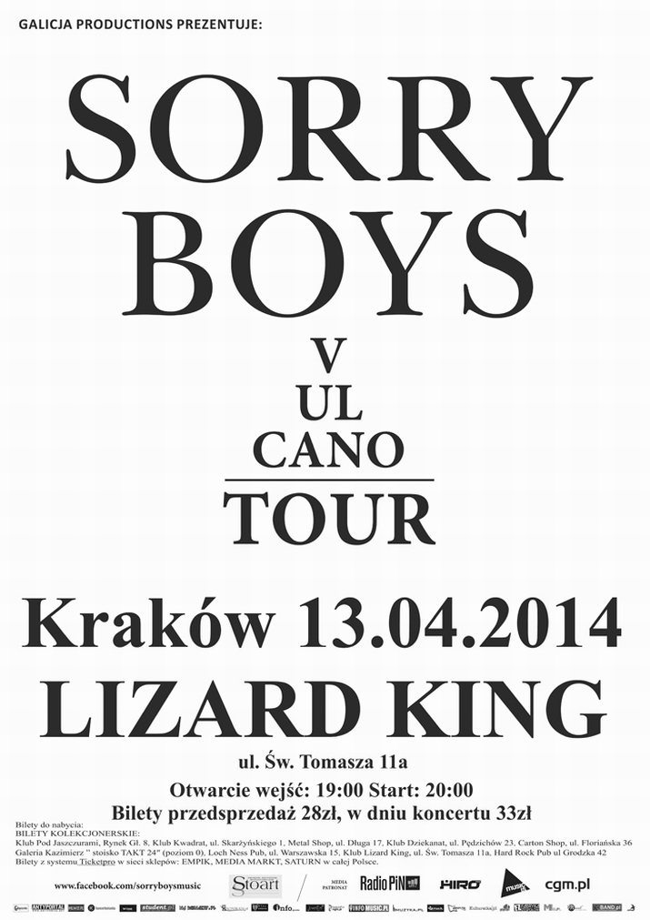 Sorry Boys, warszawska formacja, której fenomenalny debiut – „Hard Working Classes” – przypadł na rok 2010, wystąpi 13 kwietnia w krakowskim Klubie Lizard King. Jest to kolejny przystanek na trasie promującej drugi longplay grupy – album „Vulcano”. Sorry Boys ma na swoim koncie występy u boku takich wykonawców jak Hey czy Monika Brodka, a ich muzyka zbiera mnóstwo entuzjastycznych recenzji wśród krytyków muzycznych.