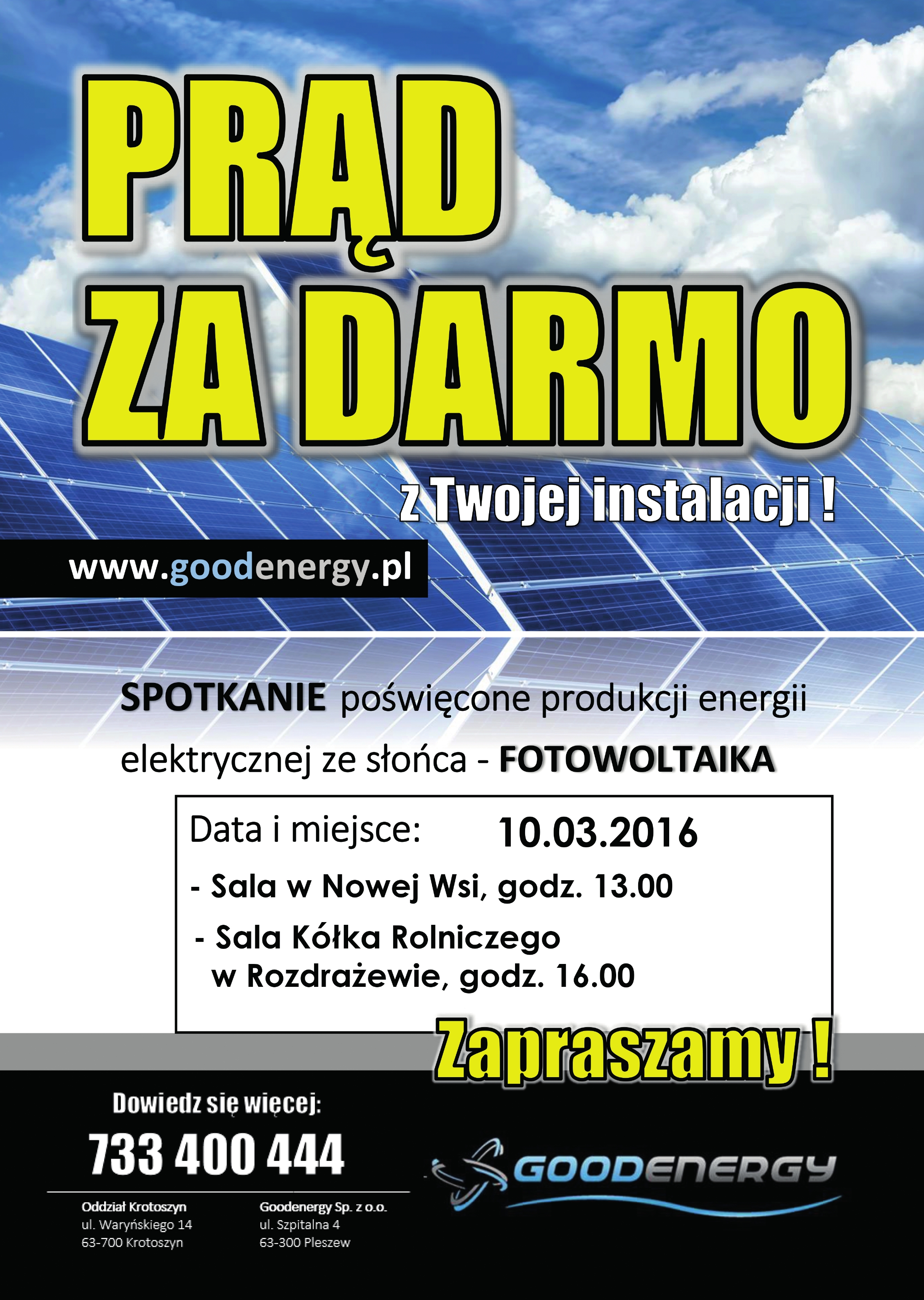 W imieniu firmy GOODENERGY zapraszamy na spotkania informacyjne poświęcone produkcji energii elektrycznej ze słońca (fotowoltaice), zasadom korzystania z niej dla własnych potrzeb i możliwościom zbycia do sieci energetycznej oraz sposobom finansowania realizacji - czytamy na portalu Gminy Rozdrażew.