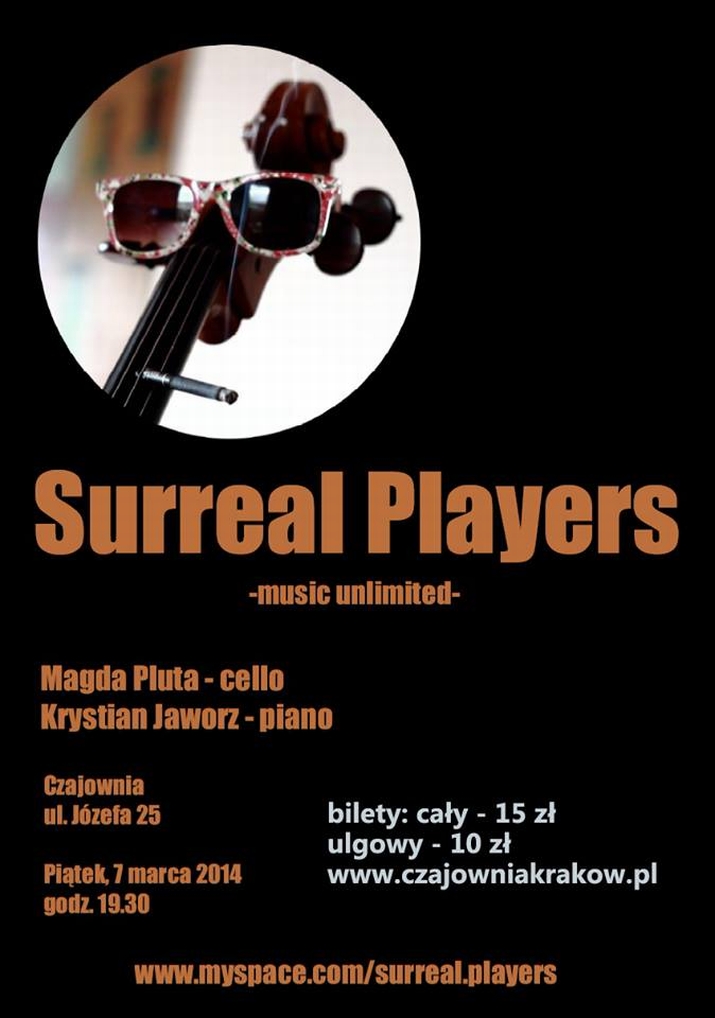 Intrygujący formalnie, przepełniony pasją i czuciem duet Magda Pluta/Krystian Jaworz, czyli formacja SURREAL PLAYERS, po raz kolejny w Krakowie! Już w najbliższy piątek o godz. 19.30 zespół – który odkryłem stosunkowo niedawno, bo 28 grudnia 2013 roku podczas fenomenalnego koncertu z cyklu „Kameralnie-kulturalnie” w Limanowskim Domu Kultury (relację z tego wydarzenia można przeczytać tutaj) – wystąpi w Herbaciarni Czajownia na krakowskim Kazimierzu, następnie 27 marca w kultowym PIEC Art acoustic JAZZ club oraz 3 kwietnia w nowosądeckim Ratuszu, w projekcie Trio z niesamowitą skrzypaczką Marlena Quartet – Renatą Borucką. Obecnie SURREAL PLAYERS pracuje nad swoim debiutanckim albumem, próbki płyty dostępne są na stronie zespołu: www.surrealplayers.com.