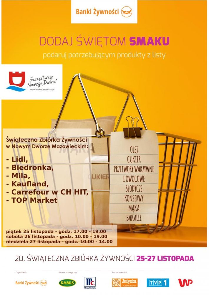 W weekend 26-27 listopada w nowodworskich marketach odbędzie się świąteczna zbiórka żywności. Wolontariuszy zbierających produkty żywnościowe będzie można znaleźć w sklepach sieci Biedronka, Lidl, Mila, Top Market, Kaufland, Carrefour w centrum handlowym Hit.