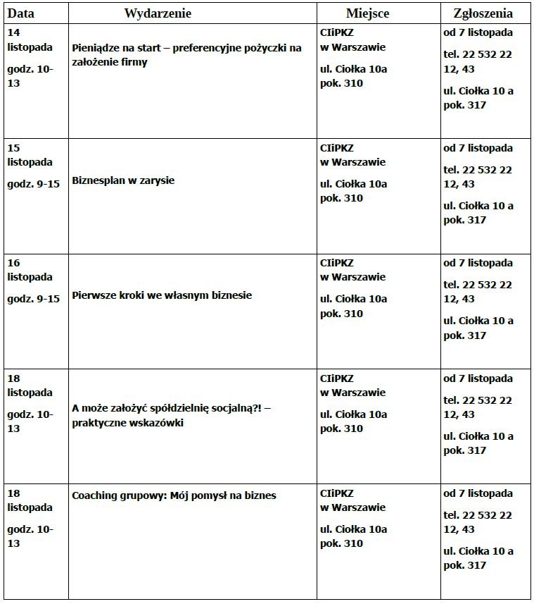 Powiatowy Urząd Pracy informuje, że Wojewódzki Urząd Pracy w Warszawie w dniach 14-18 listopada 2016 r. będzie organizował bezpłatne zajęcia z zakresu przedsiębiorczości dla osób przygotowujących się do założenia firmy.