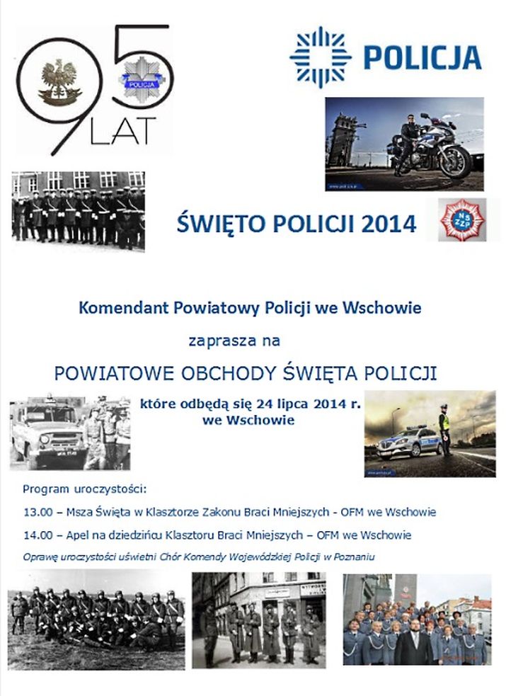 Policjanci ze Wschowy zapraszają wszystkich mieszkańców powiatu na Święto Policji, które odbędzie się 24 lipca. Początek uroczystości o godz. 13:00 w klasztorze Franciszkanów we Wschowie.