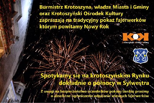 Burmistrz Krotoszyna, władze Miasta i Gminy oraz Krotoszyński Ośrodek Kultury zapraszają na tradycyjny pokaz fajerwerków, którym powitamy Nowy Rok. Spotykamy się na krotoszyńskim Rynku dokładnie o północy w Sylwestra.