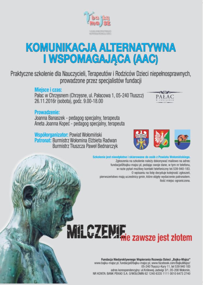 26 listopada, w godz. 9:00-18:00 w pałacu w Chrzęsnem, mieszczącym się przy ul. Pałacowej 1 odbędzie się bezpłatne szkolenie poświęcone komunikacji alternatywnej i wspomagającej (AAC).