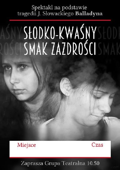 W niedzielę, 6 grudnia o godz. 15.30 Grupa Teatralna 10.50, działająca przy koźmińskim gimnazjum zaprasza na spektakl "Słodko-kwaśny smak zazdrości" na podstawie tragedii J.Słowackiego "Balladyna".