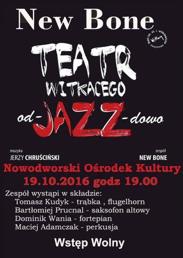 Nowodworski Ośrodek Kultury zaprasza sympatyków jazzu 19 października o godz. 19:00 na koncert, znanej już doskonale naszej publiczności, krakowskiej formacji New Bone. Zespół zaprezentuje w Nowym Dworze Mazowieckim materiał ze swojej najnowszej płyty „Teatr Witkacego odJAZZdowo”. Wstęp wolny.