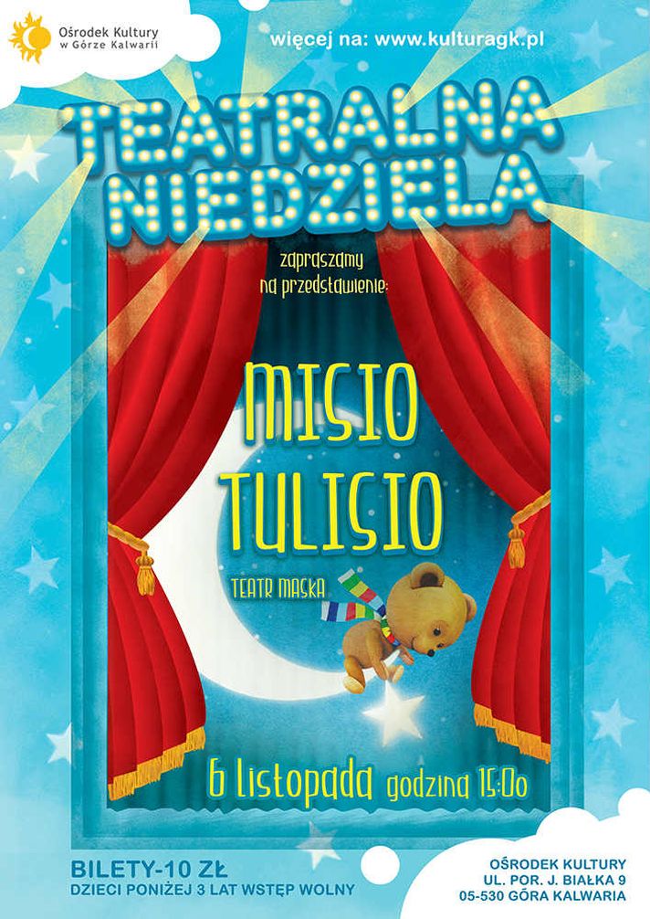Ośrodek Kultury w Górze Kalwarii zaprasza dzieci 6 listopada, o godz. 15:00 na przedstawienie pt. "Misio Tulisio". Cena biletów 10 zł, dla dzieci poniżej 3 lat wstęp wolny.