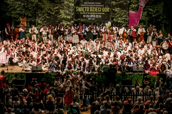 Tajwańskie baciki rozpoczynają gwizdem finałowy wieczór, dwa tajwańskie bębny wprowadzają grupę wojowników z dzidami i po chwili dziewczęta z kłosami w dłoniach… Dziękczynienie. Litewskie struny, litewski śpiew, wyprowadza dzieci z Ukrainy, Polski, Litwy, Tajwanu, Izraela, Serbii, Mołdawii… na siew. Trombita… „Ojcze z nieba Boże Panie, tu na ziemię ześlij nam Twoje święte zmiłowanie, tu na Ziemię ześlij nam…” Grupa przedstawicieli wszystkich zespołów jakby błogosławiła w kręgu tę ziemię, która daje życie. - Cały tydzień: radość, dobroć, nadzieja, dużo miłości, dziecięcej radości - mówi Józef Broda. - To jest siejba i trzeba podziękować Wiyrchnemu, że jest człowiek, który chce to oglądać. Tak to jest… Kukułeczka… Defilada wchodzi na scenę. Parada od niedzieli do niedzieli, taka piękna oktawa. Antoni Malczak: - Witam przede wszystkim dzieci, te z zespołów i te z widowni. Dziękuję wam wszystkim, żeście przychodzili mimo upalnego tygodnia. Wszystkim, którzy w jakikolwiek sposób pomogli: minister kultury i dziedzictwa Narodowego Małgorzacie Omilanowskiej, marszałkowi województwa małopolskiego Markowi Sowie, prezydentowi polskiej sekcji CIOFF Jerzemu Chmielowi. Na ręce obecnego na hali marszałka Leszka Zegzdy gorące podziękowania dla województwa za pomoc finansową, bez której nie byłoby Festiwalu. Wśród gości obecnych na hali dyrektor Malczak powitał i jednocześnie zaprosił do wręczenia upominków grupom: dyrektor Departamentu Turystyki, Sportu i Promocji Elżbietę Kantor, przewodniczącą Rady Miasta Nowego Sącza Bożenę Jawor, przedstawicieli miast goszczących w tym roku Święto Dzieci Gór, księży: dr. Stanisława Kowalika, kapelana Festiwalu oraz proboszcza św. Małgorzaty dr. Jerzego Jurkiewicza, reprezentującą Cepelię Żanetę Żardecką, która tym razem przyjechała z kilimami. Pan dyrektor podziękował pracującej cały tydzień Radzie Artystycznej, usprawiedliwił nieobecnych niektórych jej członków, podziękował koleżankom i kolegom z Sokoła, kilkudziesięciu osobom, które pracowały przy Festiwalu kierowani przez panią Małgorzatę Kalarus. Gorące, serdeczne brawa popłynęły dla Józefa Brody, bez niego – zdaniem dyrektora Malczaka - tego festiwalu by nie było lub byłby zupełnie inny. - Gdyby nie organizatorzy – powiedziała pani Żaneta Żardecka - nie moglibyśmy obejrzeć tych wspaniałych występów. Dziękuję za państwa cierpliwe oglądanie. Na kilimach jest kogut, nie wiem czy kogut z baranem się pogodzą, ale przy państwa aplauzie może to się uda. Wszystkie dzieci biorące udział w Festiwalu otrzymały również małe pacynki – baranki. Taki właśnie beczący baranek pojawia się na dłoni Józefa Brody: „Silentium, mały baranek chce wam coś powiedzieć (baranek milczy). Stary Broda wypadł z elektronicznego obiegu – nie mogę włączyć.” Przyszło dziecko, pomogło, baranek zabeczał. - Za każdą imprezą stoją jakieś tam środki finansowe - przyznał Leszek Zegzda - ale to mało znaczy, bo za tym wszystkim są ludzie, którzy maja fajny pomysł, którzy chcą coś zorganizować, ale najważniejsze są Dzieci, poznające swoje kultury. Przez jeden tydzień w roku Nowy Sącz jest stolicą dzieci i stolicą kultury świata. Na ręce Antoniego Malczaka i Józefa Brody składam podziękowania za dobro którego doświadczamy tu od 23 lat. Bożena Jawor powiedziała: - Nowy Sącz żegna Święto Dzieci Gór. I kiedy w nocy z soboty na niedzielę zaczął padać deszcz, miałam jedno skojarzenie: Nowy Sącz płacze za wami. Powiedzcie u siebie w domach, do których niedługo wrócicie, że jest takie miasto: Nowy Sącz, że jest taki Festiwal, który od wielu lat się organizuje i zawsze będzie się organizować. Niech Was Bóg błogosławi. Ks. Kowalik zaintonował: - Jak dobrze być barankiem i bardzo wczesnym rankiem, wybiegać na polankę i śpiewać sobie tak: be be be, kopytka niosą mnie, be be be, jak dobrze żyć się chce. Niech ta radość płynie na cały świat. Niech dobry Bóg prowadzi Was bezpiecznie do waszych zagród. Starzy gazdowie muszą teraz przekazać kostur i gazdowanie młodym gazdom, Małym Lachom z Nowego Sącza. Stary Gazda: - My Piątkowioki, starzy gazdowie przekazujemy wam ten kostur gazdowski, żebyście w przyszłym roku dobrze gazdowali. Mały Lach: - Obiecujemy, że nie będziemy gorsi od was. Mała Laszka potwierdziła. Władza została przekazana. - Teraz to co było zawiązane - wprowadza nas w część artystyczną Józef Broda - pomalućku zaczyna się rozwiązywać. Po kolei, jak to było od poniedziałku do soboty, żeby sobie przypomnieć. Piątkowioki najpierw same, potem dołączyły dziewczęta z Ukrainy i wspólnie zatańczyli poleczkę. Teraz dwie Ukrainki zaśpiewały piosenkę, do której lachowskie dzieci zatańczyły ukraiński taniec. A wreszcie kapela Piątkowioków, świetnie czując łemkowską nutę, podegrała Hrecznym Frairkom kołomyjkę, do której dziewczynki zaśpiewały i żywiołowo zatańczyły. Taki to był początek czasu, kiedy przypomnieliśmy sobie cały tydzień, a jednocześnie mogliśmy we wspólnych tańcach ujrzeć poblask kamractwa, które się stało w te niezwykłe osiem dni. Fujareczka „Boże mój Boże wielki, Tyś miłość i wiara, kto miłości wierzy, wszytko jej powierzy, duszo ma.” Biały śpiew Brody i czterech dziewcząt Róg… Dwa mołdawskie akordeony i siringis wyprowadzają wszystkich na estradę i przed nią. Tańczą też wszyscy obok, tam, gdzie zwykle czekali na występ. I… cięta polka, znów wszyscy. Kamractwo absolutne, idea, słowo, które staje się ciałem. Siedem narodowości na jedną nutę, jednym krokiem, z tą samą radością. Pół tysiąca dzieci… Być jednym z nich… I nigdy nie zapomnieć. Cas mo to do siebie, że się nigdy nie wróci. Życie rzeką, życie ptakiem… Człowiek chciałby śpiewać, bo przecie