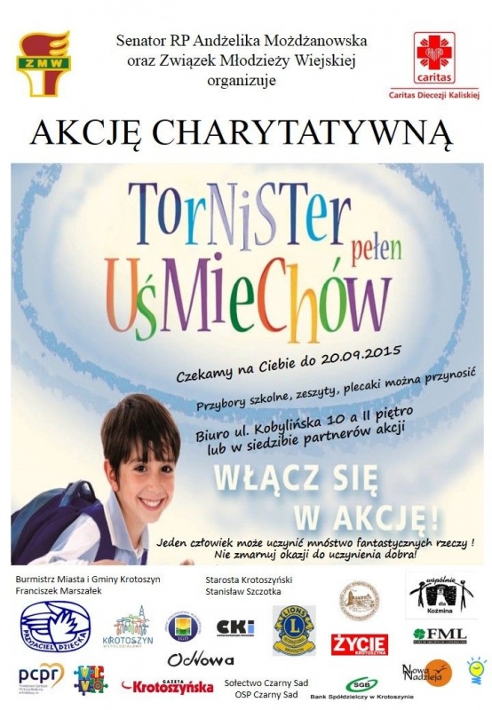 Senator Andżelika Możdżanowska oraz Związek Młodzieży Wiejskiej w Krotoszynie zapraszają do udziału w akcji charytatywnej "Tornister pełen uśmiechów".