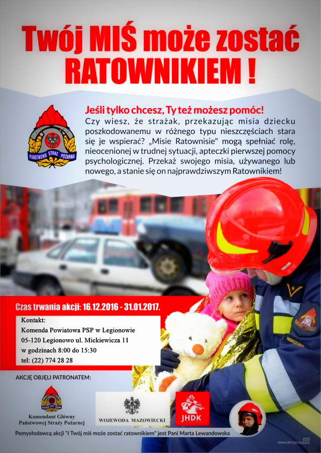 Zachęcamy do udziału w akcji "Twój miś może zostać ratownikiem" prowadzonej przez Komendę Powiatową Państwowej Straży Pożarnej w Legionowie.