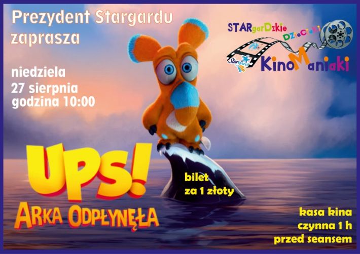 Prezydent miasta Starogard Gdański zaprasza 27 sierpnia, o godz. 10:00 starogardzkie dzieciaki - kinomaniaki na seans filmowy pt. "Ups! Arka odpłynęła". Bilety tylko za złotówkę. Można je kupić godzinę przed seansem.