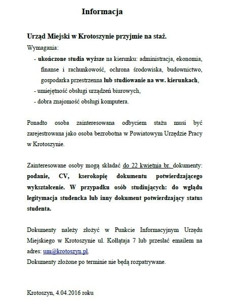 Zainteresowane osoby do 22 stycznia br. mogą składać dokumenty - informuje portal krotoszyńskiego ratusza.